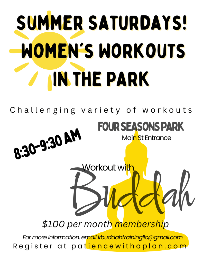 Women’s Workouts begin the week of April 19th and run throughout the summer on Saturday mornings from 8:30-9:30 at outdoor locations and occasionally indoor locations. Please check with Buddah for the correct location for each Saturday. There may be a few Saturday blackout dates during the program. No workout on Saturday May 10 or 24. Please contact Buddah at kbuddahtrainingllc@gmail.com or through the contact me form with any questions and for more details any time.